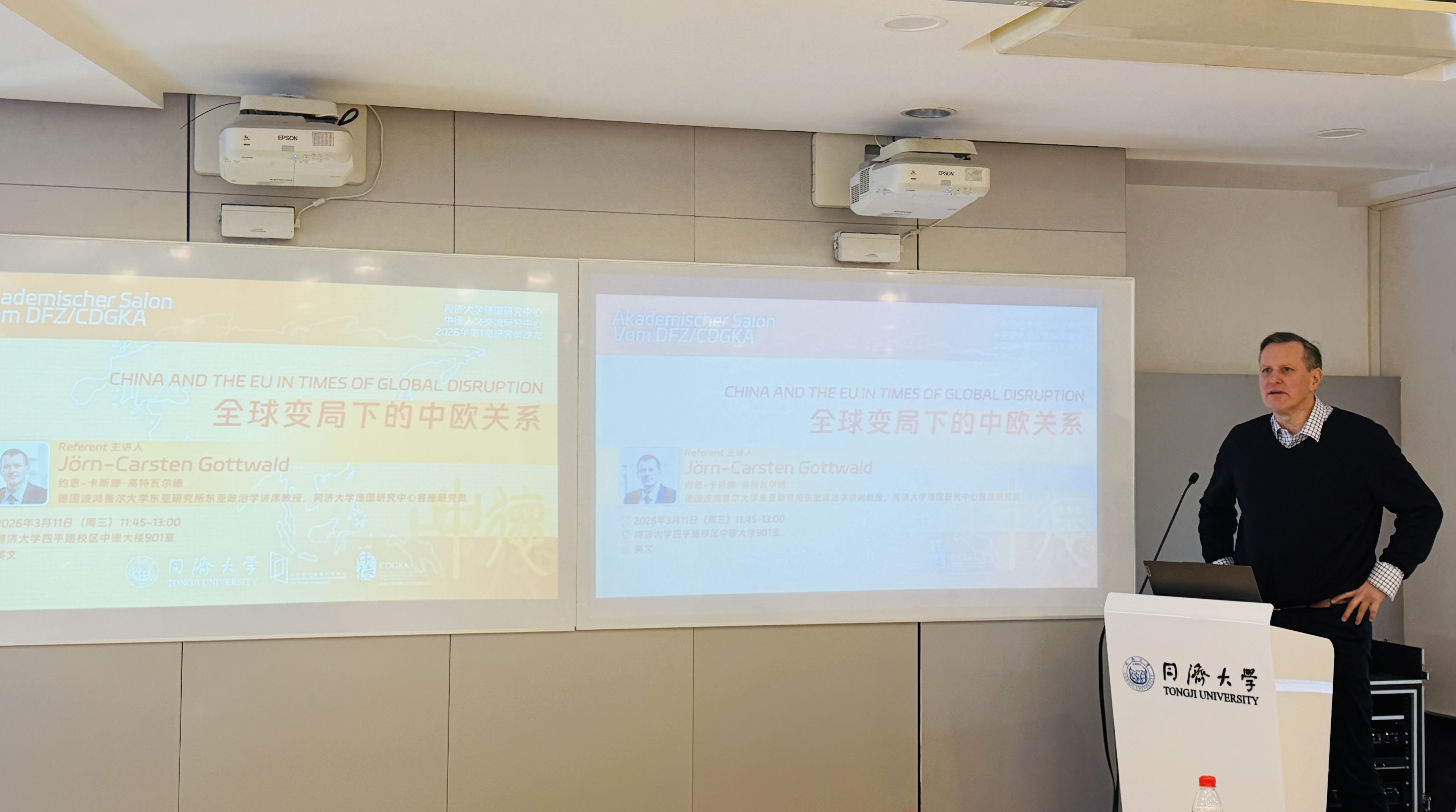 3月11日,应同济大学德国研究中心邀请,德国波鸿鲁尔大学东亚研究所东亚政治学讲席教授、同济大学德国研究中心客座研究员约恩-卡斯滕·高特瓦尔德(Jörn-Carsten Gottwald)访问中心,并围绕“全球变局下的中欧关系”(China and the EU in Times of Global Disruption)开展学术沙龙活动。来自同济大学德国研究中心及相关院系的师生参加活动。